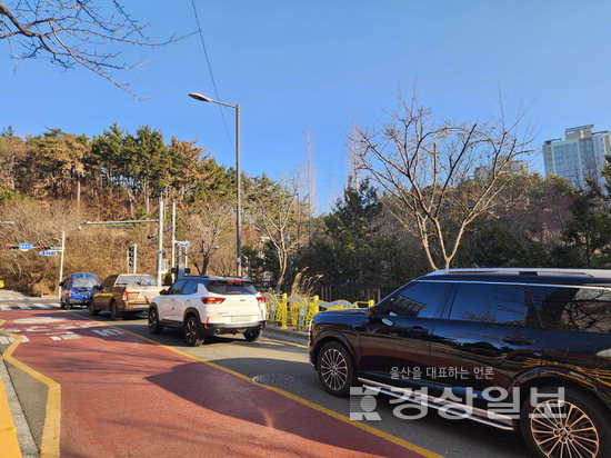 27일 오전 찾은 중구 우정혁신도시 에일린의뜰 1차 아파트 옆 종가5길. 인근에 울산초등학교가 위치해 있고 주변으로 1200여 가구의 공동주택이 밀집해 있다. 출근 시간대가 되자 종가로로 진입하려는 차량들이 잇따라 몰리며 도로는 금세 정체됐고, 교차로 인근에는 짧은 신호 주기 때문에 차량 행렬이 길게 늘어섰다.