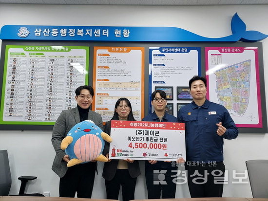 제이콘(대표이사 홍대성)이 28일 울산 남구 삼산동을 방문해 이웃돕기 후원금 450만원을 전달했다. 후원금은 사회복지공동모금회를 통해 관내 사회복지시설의 개보수에 사용될 예정이다. 홍대성 제이콘 대표이사는 “남구에서 터를 잡고 성장해온 기업으로서 어려운 이웃들에게 온기를 전하고 싶었다”고 말했다.