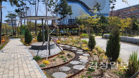 여기는 온통 동그라미 세상이다. 화단도 자전거 거치대도 작은 연못도 지붕이 있는 의자도 모두 원형이다. 다른 곳과는 차별화된 그 무언가가 더 있을 것이라는 생각으로 주변을 탐색하기 시작했다. 몇 걸음 앞 표지판에 “2021년 정원 분야 실습·보육공간 조성사업”이라는 것과 원형의 설계도가 그려져 있었다.