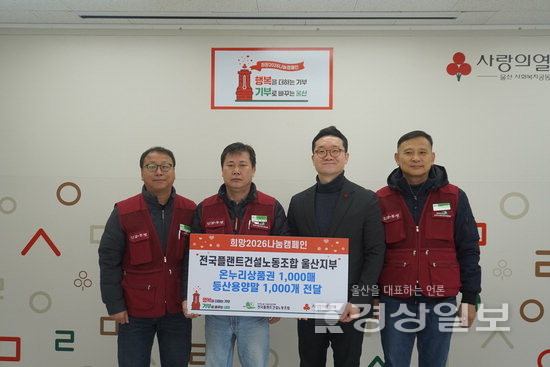 전국플랜트노동조합은 지난달 30일 울산사회복지공동모금회를 통해 양말과 온누리상품권 각 1000매를 기탁하며 지역사회 이웃사랑을 실천했다. 기탁 성품은 울주군·남구 저소득가구의 겨울철 생활에 실질적인 도움을 줄 예정이다. 이문세 전국플랜트노조 지부장은 “함께 살아가는 이웃에게 보탬이 되고자 조합원들의 마음을 모았다. 앞으로도 나눔으로 사회적 책임을 다하겠다”고 말했다. 정혜윤기자 저작권자 © 울산일보 무단전재 및 재배포 금지 정혜윤 기자 다른기사 보기 페이스북 트위터 카카오스토리 URL복사 기사공유하기