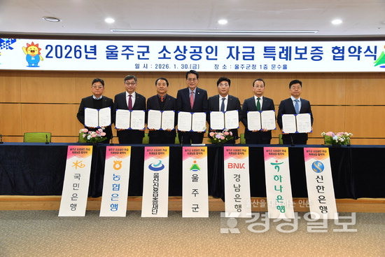 울주군은 지난달 30일 군청 문수홀에서 울산신용보증재단과 경남은행, 농협은행, 하나은행, 국민은행, 신한은행 등 5개 금융기관과 ‘2026년 소상공인 자금특례보증 지원 업무협약’을 체결했다. 협약을 통해 울주군 25억원, 참여 금융기관 25억원 등 총 50억원을 울산신용보증재단에 공동 출연한다. 재단은 이를 기반으로 600억원 규모의 융자를 보증(보증서 100%)한다.