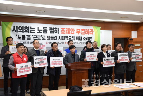 민주노총·한국노총 울산지역본부, 울산시민연대 등 21개 시민사회단체는 이날 시의회 프레스센터에서 기자회견을 열고 “울산은 노동의 역사를 합의로 쌓아온 도시다. 이를 시의회가 일방적으로 거꾸로 돌릴 권리는 없다”고 밝혔다.