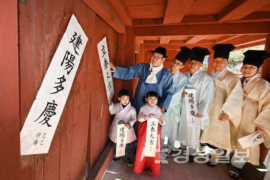 입춘을 하루 앞둔 3일 울산향교에서 고문구 전교와 유림들이 2026년 행운과 건강을 기원하며 ‘입춘대길’과 ‘건양다경’이 적힌 입춘방을 붙이고 있다. 김동수기자 dskim@ksilbo.co.kr