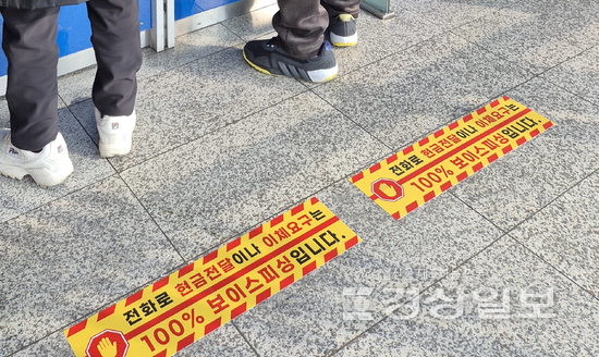 전화 통화에 집중한 나머지 무의식적으로 기기 앞까지 접근하는 피해자가 바닥에 표시된 경고 문구를 보고 잠시 멈춰 서며 범죄 상황임을 인지하도록 유도하는 일종의 심리적 제동 장치다. 정지선 바닥에는 시인성이 높은 적색과 황색을 활용해 ‘전화로 현금 전달이나 이체 요구는 100% 보이스피싱입니다’라는 직관적인 문구를 삽입했다.