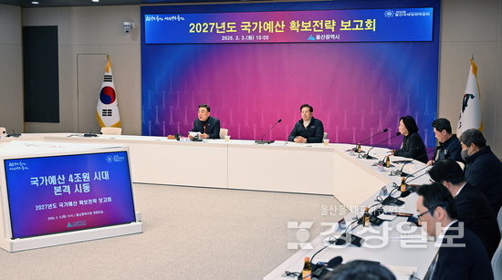 국가예산 4조원 시대를 목표로 하는 2027년도 국가예산 확보전략 보고회가 3일 울산시청 대회의실에서 열렸다. 김두겸 울산시장이 경제부시장, 실·국·본부장 등이 참석한 가운데 회의를 주재하고 있다. 김도현기자 do@ksilbo.co.kr