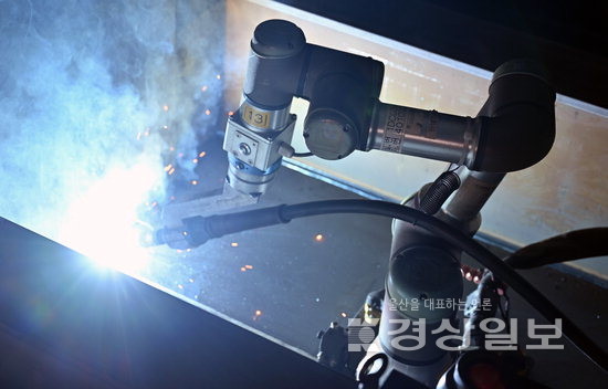 현장 한편에서는 ‘용접협동로봇’도 가동 중이었다. 무게 15㎏가량인 용접협동로봇은 작업자가 용접할 위치에 놓으면 로봇 팔이 각도를 조정해 사람이 움직이는 것처럼 용접을 한다. 협동로봇을 비롯해 용접로봇을 활용하면 중상급 이상의 용접 품질을 확보할 수 있고, 신규 수주로 용접 물량이 크게 늘어날 때도 유연하게 대응할 수 있다. HD현대중공업은 로봇을 가상환경에서 학습시키는 방식으로 자동화 범위를 더 넓히기 위한 검토도 진행 중이다.