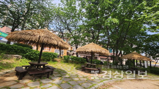 안내도가 있는 곳으로 진입하면 자모음의 바닥 타일이 먼저 반긴다. 여기를 지나면 두 갈래 길이 바로 나온다. 나는 왼쪽부터 돌아보기로 했다. 운동기구가 놓인 앞쪽 억새 잎으로 지붕을 엮은 세 개의 테이블과 의자가 시선을 확 끈다. 꼭 민속촌에 온 듯한 느낌을 갖게 한다. 진갈색을 띤 원목 놀이기구들이 여러 군데 보인다. 주변이 자연스럽게 어우러져 인공적인 것마저도 자연적인 느낌을 준다.