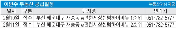 8일 부동산R114에 따르면 2월 둘째주에는 전국 2개 단지 총 3492가구(일반분양 901가구)가 공급된다. 단지별로 부산 해운대구 재송동 ‘e-편한세상센텀하이베뉴’와 인천 남동구 간석동 ‘포레나더샵인천시청역’에서 청약을 진행한다.