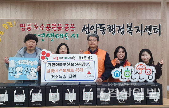 ▲ 한화솔루션 울산공장은 설 명절을 맞아 9일 선암동행정복지센터를 방문해 관내 저소득층 45가구에 참기름·들기름 선물세트를 기부했다.한화솔루션 울산공장은 설 명절을 맞아 9일 선암동행정복지센터를 방문해 관내 저소득층 45가구에 참기름·들기름 선물세트를 기부했다. 저작권자 © 울산일보 무단전재 및 재배포 금지 정혜윤 기자 다른기사 보기 페이스북 트위터 카카오스토리 URL복사 기사공유하기