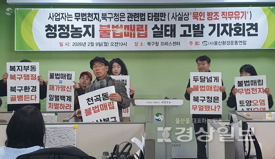 울산환경운동연합은 9일 북구청 프레스센터에서 기자회견을 열고 상안동에서 진행 중인 농지 성토 작업이 명백한 농지법 위반임에도, 북구청이 늑장대응으로 불법공사를 방관하고 있다고 주장했다.