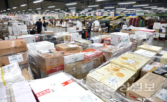 민족의 명절인 설 연휴를 앞두고 11일 울산 북구 진장동 울산우편집중국에 선물 택배가 가득 쌓인 가운데 직원들이 분주하게 물건을 옮기고 있다. 김도현기자 do@ksilbo.co.kr