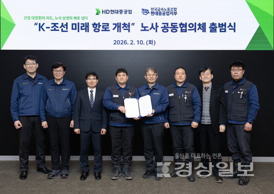 HD현대중공업은 지난 10일 울산 본사에서 금석호 HD현대중공업 사장과 김동하 금속노조 현대중공업지부장, 양영봉 고용노동부 울산지청장, 황기돈 나은내일연구원 이사장 등이 참석한 가운데 ‘K-조선 미래 항로 개척을 위한 노사 공동협의체 출범식’을 열었다고 11일 밝혔다.