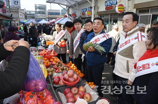 11일 김두겸 울산시장과 박천동 북구청장 등이 설 명절을 앞두고 오일장이 열린 북구 호계공설시장을 방문해 장보기를 하면서 상인들을 격려했다. 김동수기자 dskim@ksilbo.co.kr