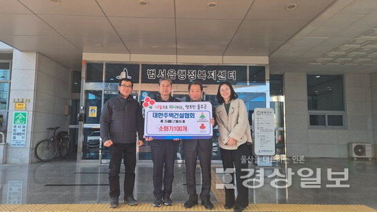 ▲ 대한주택건설협회(울산·경남도회 회장 김찬수)가 12일 울산 울주군 범서읍에 지역 취약계층의 안전한 생활환경 조성을 위한 소화기 100개를 기탁했다.대한주택건설협회(울산·경남도회 회장 김찬수)가 12일 울산 울주군 범서읍에 지역 취약계층의 안전한 생활환경 조성을 위한 소화기 100개를 기탁했다. 저작권자 © 울산일보 무단전재 및 재배포 금지 신동섭 기자 다른기사 보기 페이스북 트위터 카카오스토리 URL복사 기사공유하기