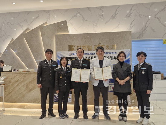 ▲ 울산남구자율방범연합대(대장 서정환)와 디지털365치과의원(원장 길상춘)은 지난 13일 디지털365치과의원에서 남구자율방범연합대 대원과 대원 가족의 구강건강 증진을 위한 업무협약을 체결했다.울산남구자율방범연합대(대장 서정환)와 디지털365치과의원(원장 길상춘)은 지난 13일 디지털365치과의원에서 남구자율방범연합대 대원과 대원 가족의 구강건강 증진을 위한 업무협약을 체결했다. 저작권자 © 울산일보 무단전재 및 재배포 금지 신동섭 기자 다른기사 보기 페이스북 트위터 카카오스토리 URL복사 기사공유하기