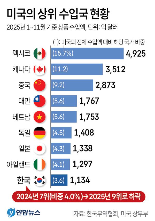 한국은 지난해 미국 전체 수입액의 3.6%를 기록해 10대 수입국 중 9위에 머물렀다. 도널드 트럼프 미국 행정부 출범 직전인 2024년(4.0%·7위)과 비교해 두 계단 밀려난 셈이다.