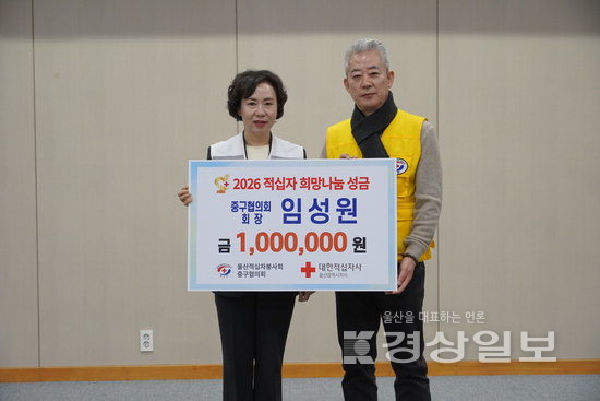 ▲ 대한적십자사봉사회 울산중구협의회 임성원 회장은 19일 대한적십자사 울산지사에 희망나눔성금 100만원을 전달하며 지역사회에 따뜻한 나눔을 전했다.대한적십자사봉사회 울산중구협의회 임성원 회장은 19일 대한적십자사 울산지사에 희망나눔성금 100만원을 전달하며 지역사회에 따뜻한 나눔을 전했다. 저작권자 © 울산일보 무단전재 및 재배포 금지 정혜윤 기자 다른기사 보기 페이스북 트위터 카카오스토리 URL복사 기사공유하기
