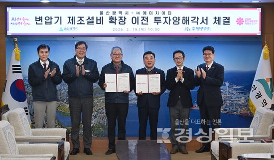 울산시는 19일 시청 본관 7층 시장실에서 김두겸 울산시장과 김형일 에이치이티 대표이사 등이 참석한 가운데 ‘변압기 제조설비 확장 이전 투자양해각서(MOU)’를 체결했다.