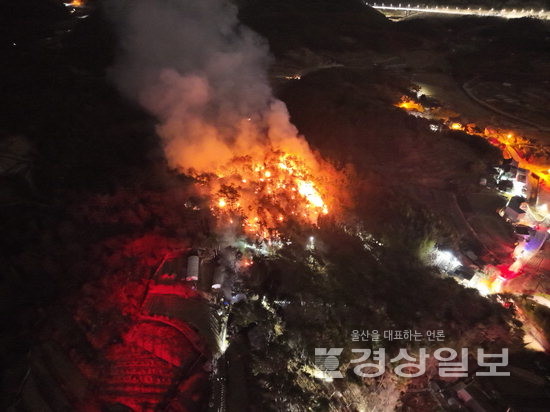 22일 울산소방본부 등에 따르면, 이날 오전 3시44분께 성안동 야산에서 불이 났다. 소방은 헬기 3대, 차량 28대, 인력 97명을 투입해 진화 작업을 벌였다.