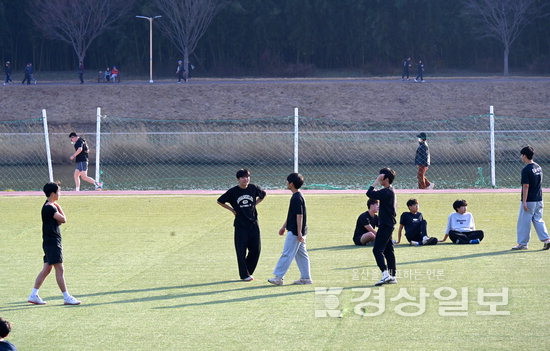 22일 울산지역 낮 최고기온이 21℃까지 오르는 등 따뜻한 봄날씨를 보인 가운데 중구 태화강둔치 축구장에서 학생들이 반소매와 반바지 차림으로 운동을 즐기고 있다. 김동수기자 dskim@ksilbo.co.kr