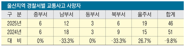 22일 울산경찰청에 따르면, 지난해 울산에서는 교통사고로 총 46명이 사망했다. 2024년 51명에서 9.8% 감소한 수치다.