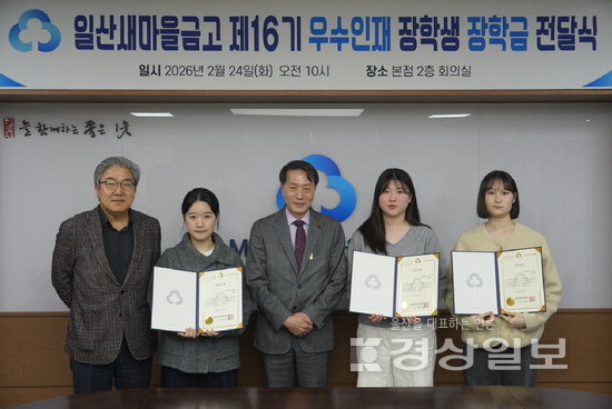 일산새마을금고(이사장 박학천)는 24일 본점 2층 회의실에서 울산 동구 우수인재 장학생 3명에게 장학증서를 전달했다. 우수인재로 선정된 학생은 대학 4년간 장학금을 수령하게 된다. 일산새마을금고는 2011년부터 지역 인재양성을 위해 우수인재 장학생 지원을 이어가고 있다. 현재까지 58명에게 3억600여만원을 지급했다. 일산새마을금고 제공