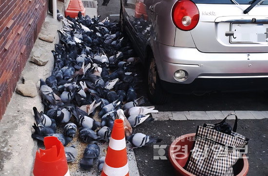 25일 울산 울주군 구영리와 남구 남산 등 일대. 산책하던 일부 주민이 주머니에 담긴 곡물을 인도와 등산로에 뿌리자 순식간에 비둘기 수십 마리가 몰려들었다. 도로 가장자리와 횡단보도 앞까지 비둘기 떼가 점령하면서 근처를 오가던 시민들은 발길을 주춤거리기도 했다. 어떤 시민은 익숙한듯 프라이팬을 꺼내들고 “먹이를 주지 마라. 차도로 튀어나온다”며 쫓아내는 진풍경도 벌어졌다.