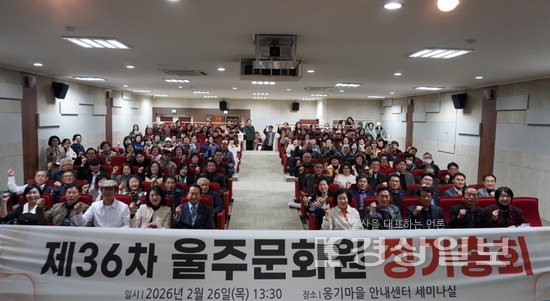 ▲ 울주문화원(원장 손영우)은 26일 울주군 외고산 옹기마을 안내센터 세미나실에서 제36차 정기총회를 개최했다. 임원·회원 등 약 150여명이 참석해 2025년도 사업실적·결산 승인, 2026년도 사업계획(안) 및 예산(안) 확정, 임원 선임의 건을 의결했다.울주문화원(원장 손영우)은 26일 울주군 외고산 옹기마을 안내센터 세미나실에서 제36차 정기총회를 개최했다. 임원·회원 등 약 150여명이 참석해 2025년도 사업실적·결산 승인, 2026년도 사업계획(안) 및 예산(안) 확정, 임원 선임의 건을 의결했다.