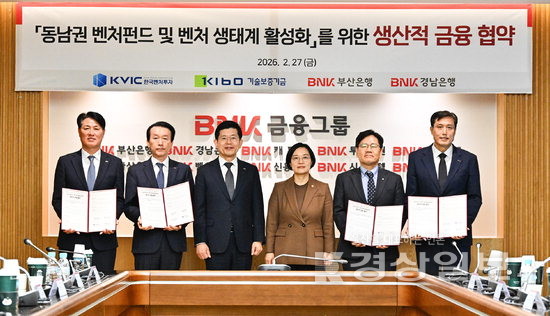 BNK경남은행과 BNK부산은행은 지난달 27일 부산은행 본점에서 한국벤처투자(KVIC), 기술보증기금(KIBO)과 함께 동남권 혁신기업 성장 기반 조성을 위한 업무협약을 체결했다고 2일 밝혔다.