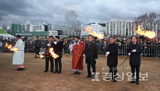 3일 울산 남구 태화강둔치에서 열린 2026 정월대보름 달맞이 행사에서 사진 오른쪽부터 이강수 남구문화원장과 김두겸 울산시장, 서동욱 남구청장 등이 달집에 불을 붙이고 있다. 김동수기자 dskim@ksilbo.co.kr