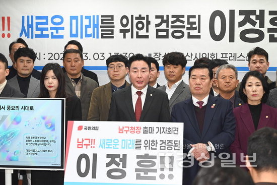 이정훈 남구청장 출마 예정자는 3일 울산시의회 프레스센터에서 기자회견을 열고 “울산 남구의 미래를 보수우파의 가치 위에 바로 세우고, 젊은 엔진, 인공지능(AI) 전문가의 정밀한 시각으로 울산 남구를 다시 뛰게 하겠다”며 오는 6월 지방선거에 국민의힘 소속으로 남구청장에 출마하겠다고 밝혔다.