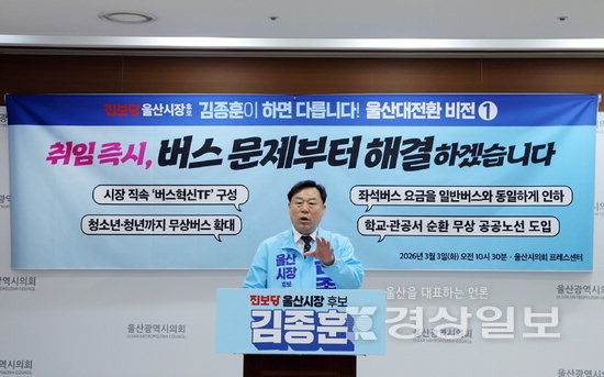 김종훈 울산시장 예비후보는 3일 울산시의회 프레스센터에서 기자회견(사진)을 열고 “울산 시민 대부분이 승용차를 이동 수단으로 이용하고 있지만, 승용차를 이용하지 못하는 어르신과 청소년은 큰 불편에도 울며 겨자 먹기로 버스를 이용하고 있다”며 “울산에서 버스는 단순한 대중교통이 아니라 시민의 기본권이며 공공 인프라로 근본적인 전환이 필요하다”고 밝혔다.