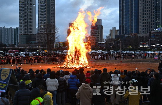정월대보름인 3일 울산 남구 태화강둔치에서 남구문화원 주최로 2026 정월대보름 달맞이 행사가 열린 가운데 올 한 해 시민들의 건강과 안녕을 기원하는 대형 달집이 불타고 있다. 김동수기자 dskim@ksilbo.co.kr