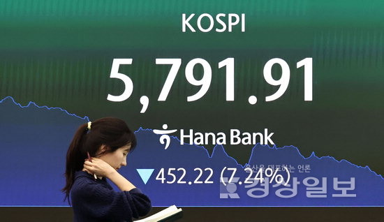 3일 유가증권시장에서 코스피는 전 거래일보다 452.22p(7.24%) 내린 5791.91로 마감했다. 이날 코스피 낙폭(452.22p)은 역대 최대였다.