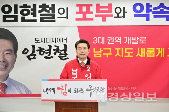 임현철 남구청장 예비후보는 4일 울산시의회 프레스센터에서 기자회견을 열고 “남구는 변화냐 정체냐의 갈림길에 있다. 단순히 건물을 짓고 도로를 닦는 방식으로는 안 된다”며 “역동적인 남구를 위해 세 가지 핵심축을 중심으로 남구 지도를 새로 그리겠다”고 밝혔다.